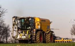 Der Selbstfahrer fährt genau spurversetzt und schlitzt die Gülle in 3-4 cm Tiefe in den Boden. Der Spurversatz ist enorm wichtig, damit das Getreide geschont wird.